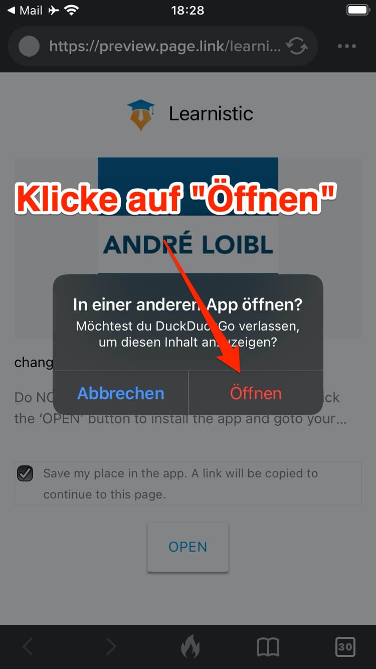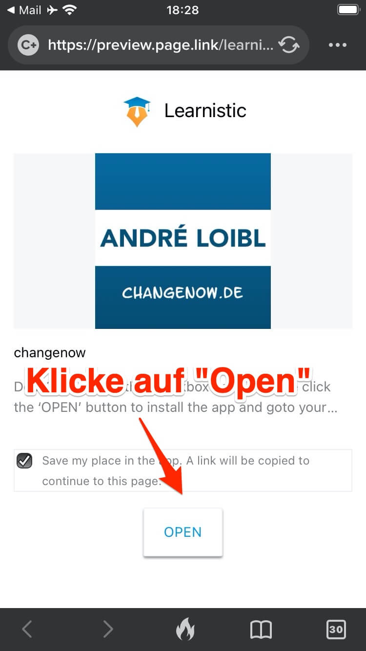 Dann öffnet sich Dein Browser auf dem Handy. Da auf "Open" klicken: