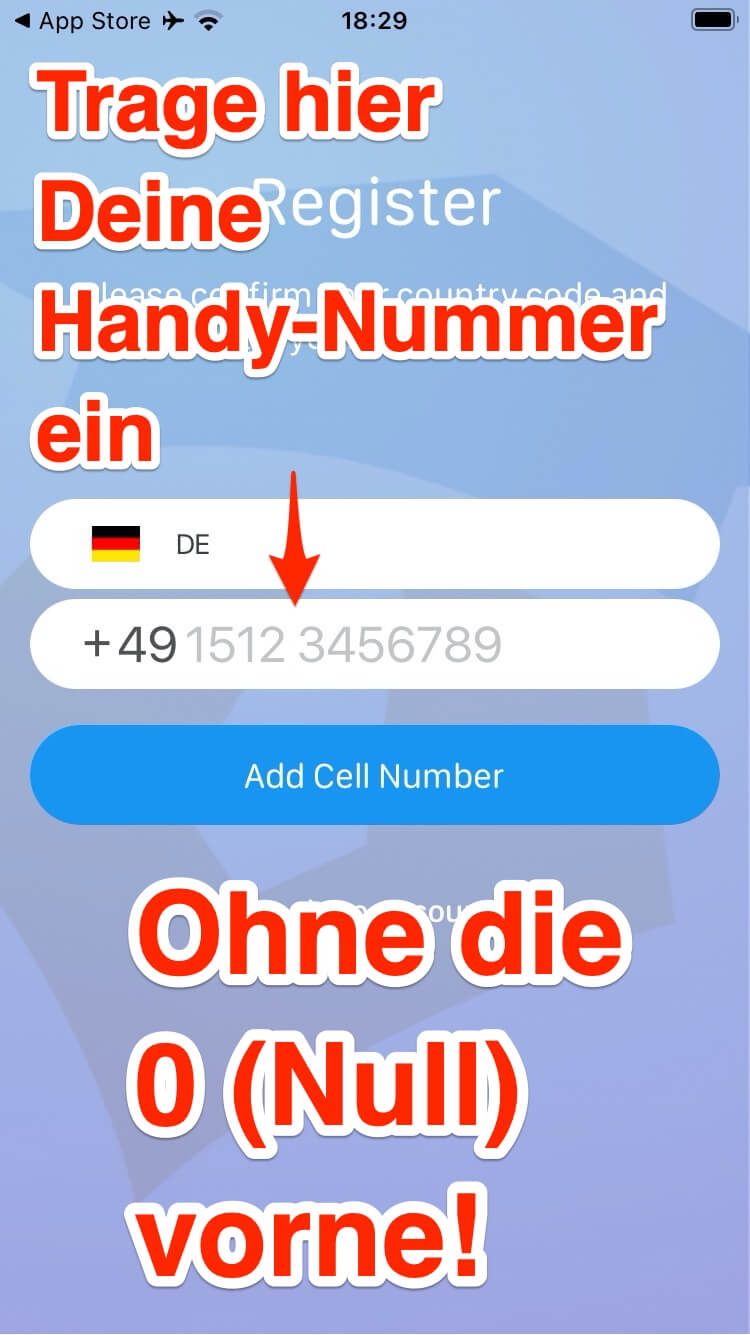 Trage hier Deine Handynummer ein - mit Vorwahl, nur ohne die Null ganz am Anfang: