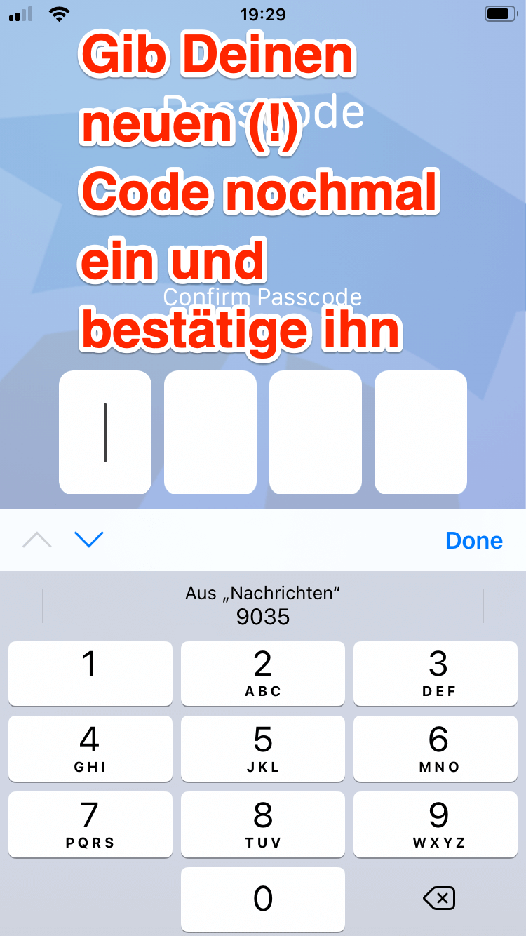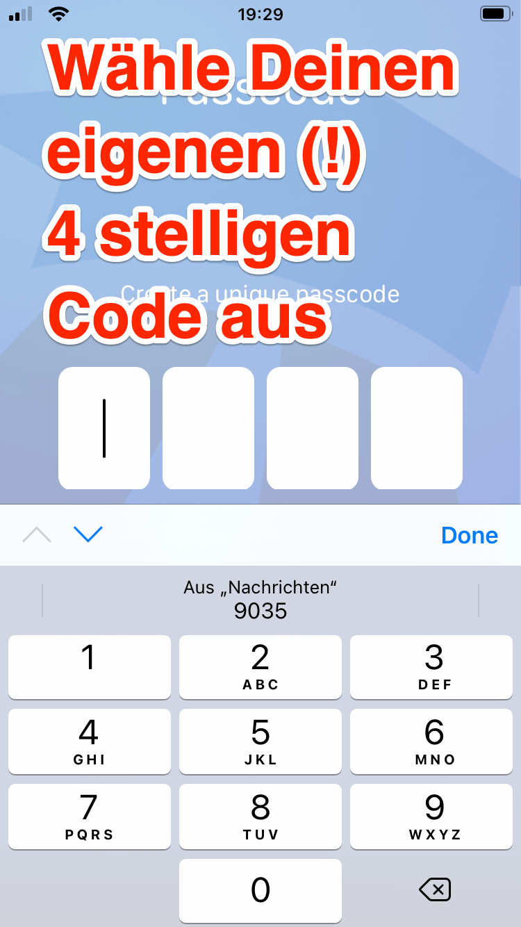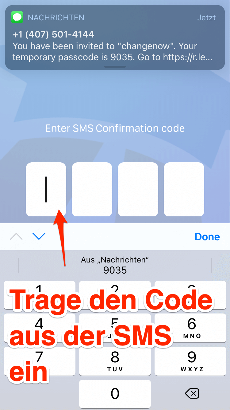 Jetzt bekommst Du eine SMS mit einem Passcode. Trage diesen 4-stelligen Code in das Feld ein: